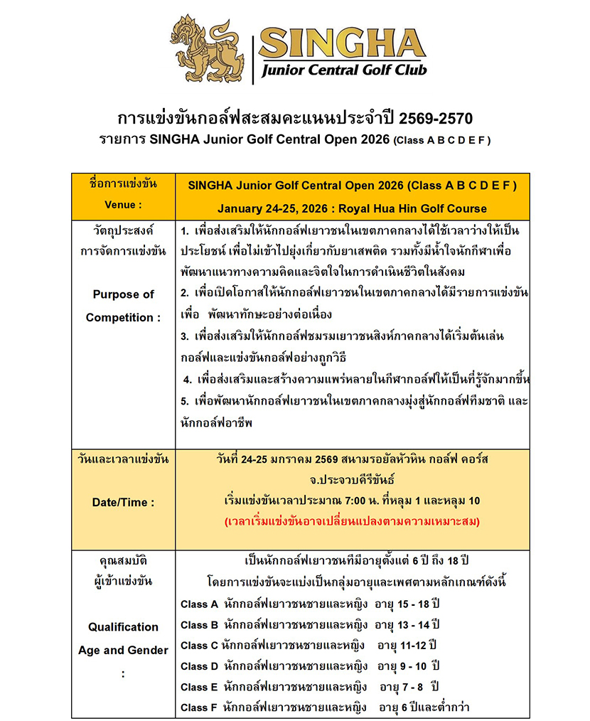 การแข่งขันกอล์ฟ เยาวชนชมรมสิงห์ภาคกลาง Open Match